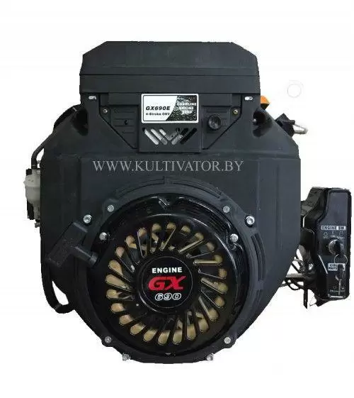 Бензиновый двигатель модели GX690E воздушного охлаждения с электростартером, OHV, номинальной мощностью 25 лс, гильзованный, моторесур не менее 3500 моточасов. Для строительной техники, минитракторов, электростанций, буровых вышек и т.п. В данном двигателе установлена система аварийного отключения двигателя при низком уровне масла.