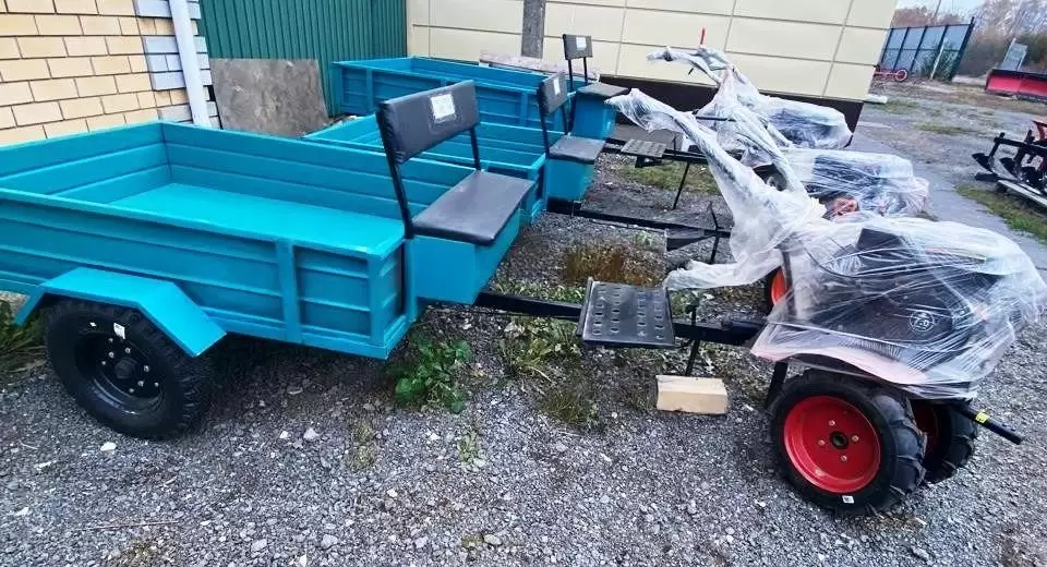 Тележка прицепная двухместная предназначена для эксплуатации с мотоблоками мощностью не менее 3,5 кВт. Используется для перевозки сельскохозяйственных, строительных и хозяйственных грузов в условиях приусадебных участков, садов и огородов коллективного и индивидуального пользования, а также на животноводческих фермах, в теплицах и в коммунальном хозяйстве.