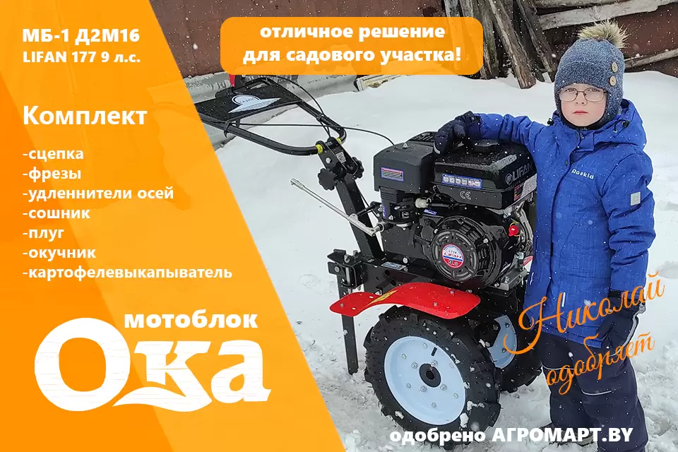 Мотоблок «Ока» предназначен для выполнения широкого комплекса сельскохозяйственных, транспортных, коммунальных работ на приусадебных участках, фермерских хозяйствах, круглогодичной механизированной уборки тротуаров, дорожек, газонов.