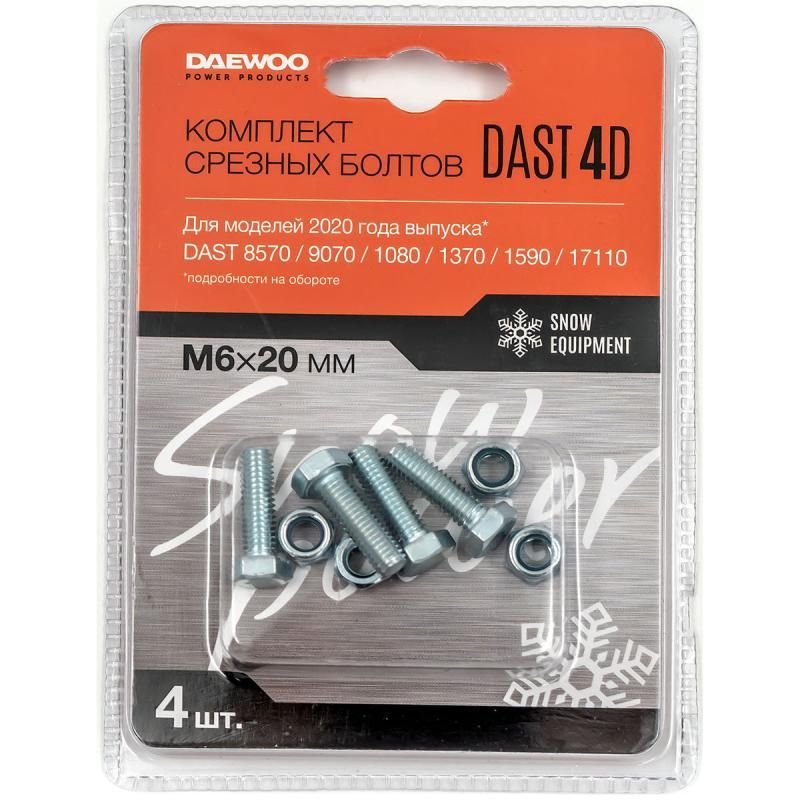 - Совместимость с моделями: DAST 8065 / 8565 / 8570 / 9070 / 1080 / 1370 / 1590 / 17110 (2020 года производства и позже). Для определения совместимости болтов с Вашей модель, проверьте серийный номер изделия. Он должен заканчиваться на цифру 20 и больше. Если серийный номер заканчивается на цифру 19 и меньше, то Вам следует приобрести другой комплект срезных болтов DAST 4C.
