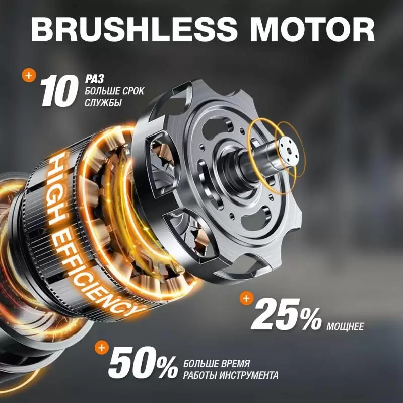 - Бесщеточный электродвигатель. Бесщеточный двигатель обеспечивает высокую мощность при меньшем потреблении энергии, что позволять работать до 30% времени дольше на одном заряде аккумулятора.