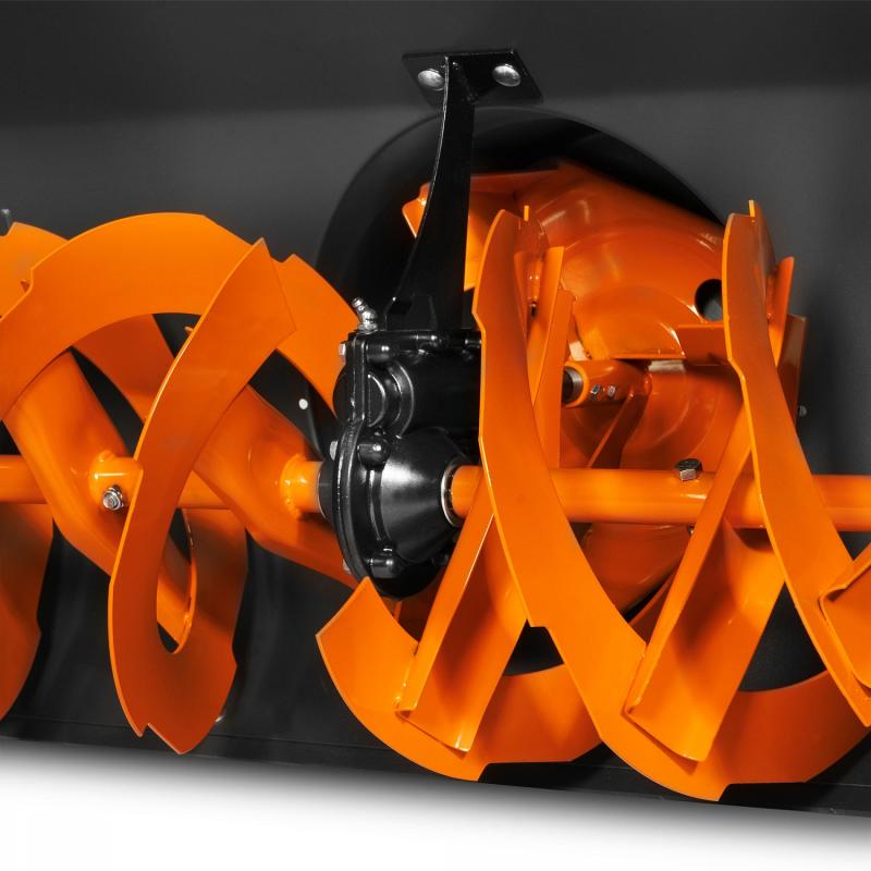 - Усиленный редуктор в паре со стальными опорами шнека с подшипниками передает до 95% крутящего момента на рабочие узлы сборки и выброса снега. Выходной вал редуктора крепится на подшипниках большого диаметра, что обеспечивает высокую устойчивость механизмов к вибрации и ударам.